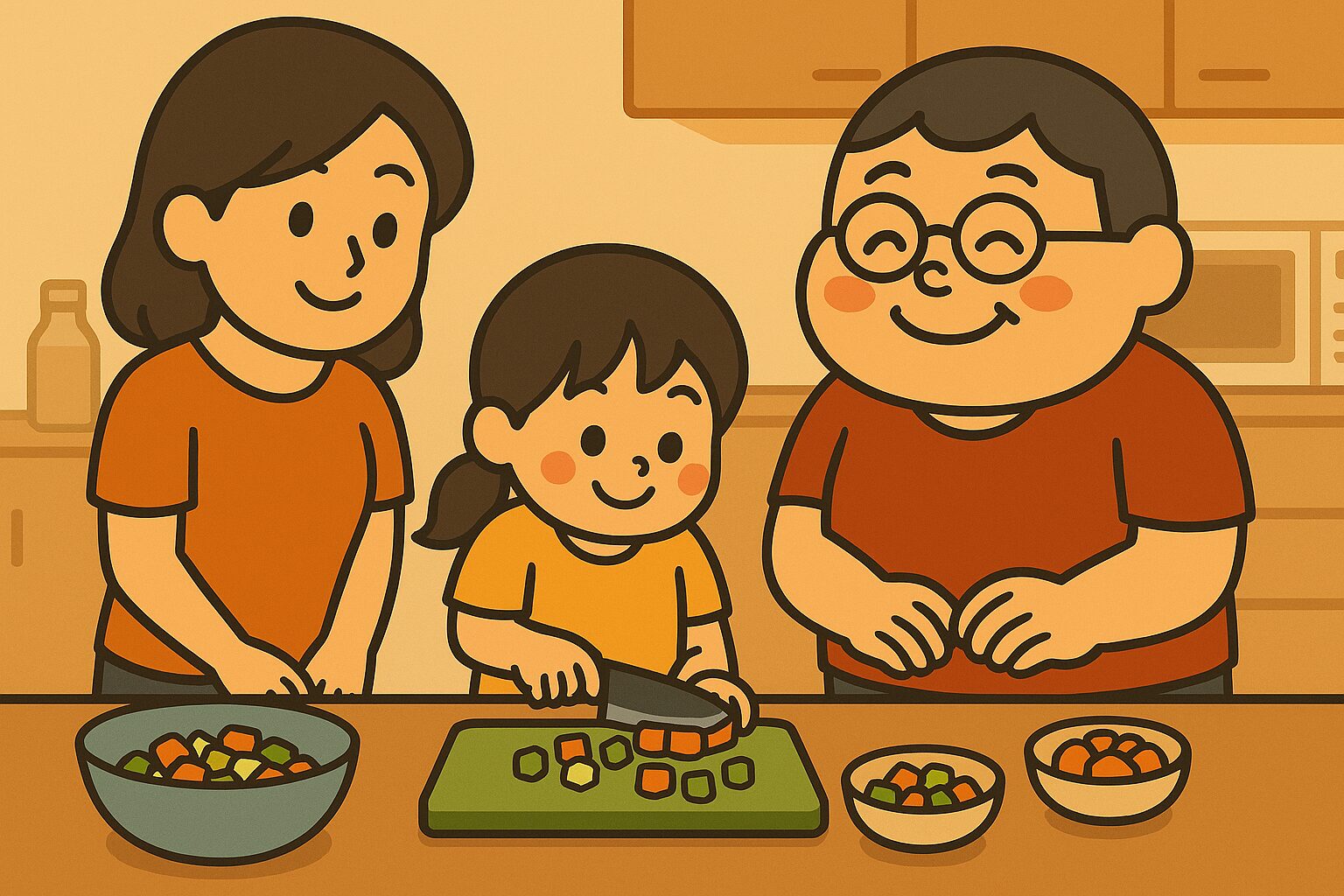 朝、娘が小さな包丁を持ち出して、キュウリとニンジンをゆっくり慎重に切っていました。