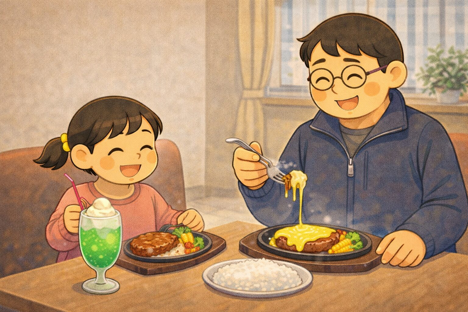 「メロンクリームソーダ、デミグラスハンバーグステーキ!」