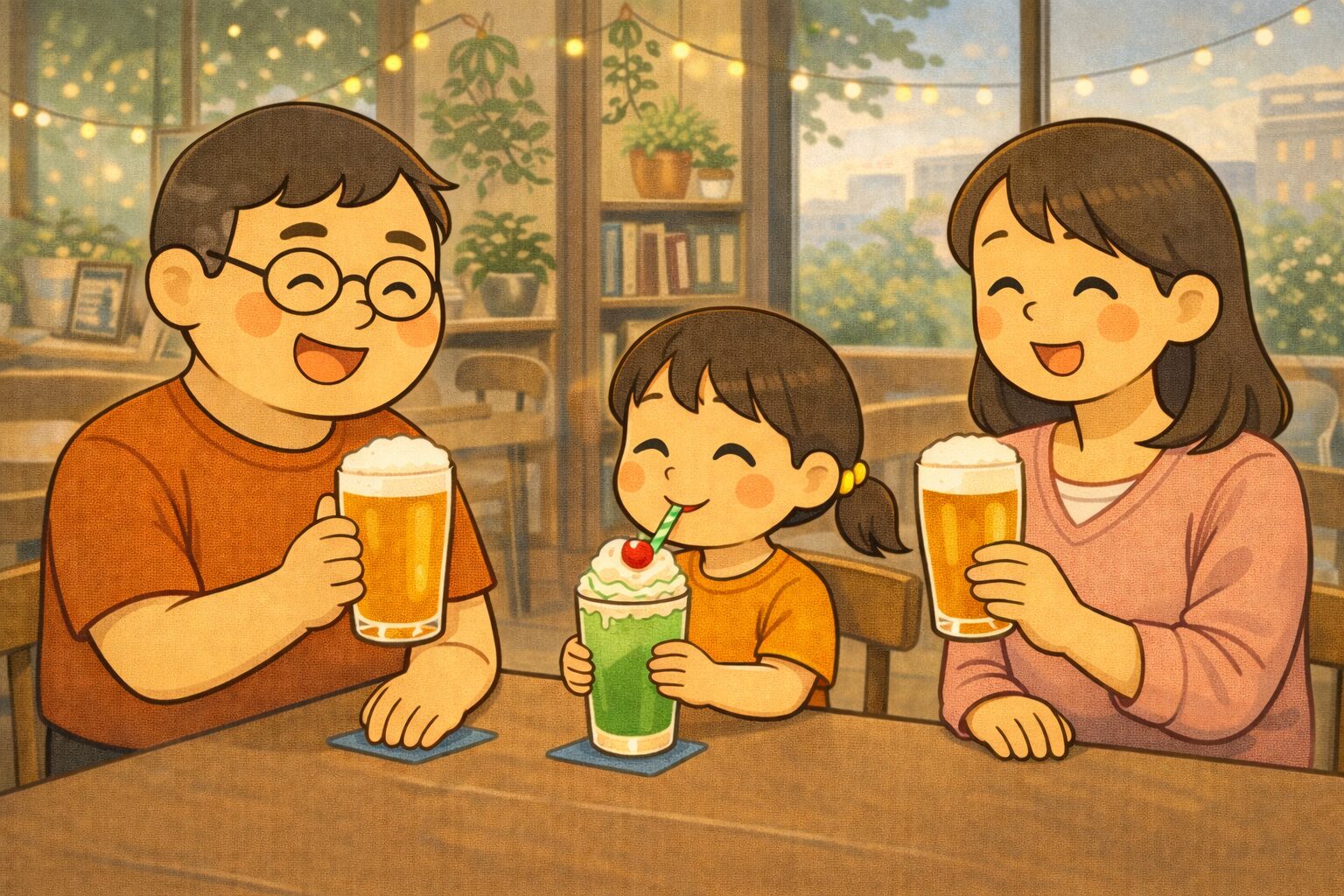 ママと私はクラフトビール、娘はメロンクリームソーダ。