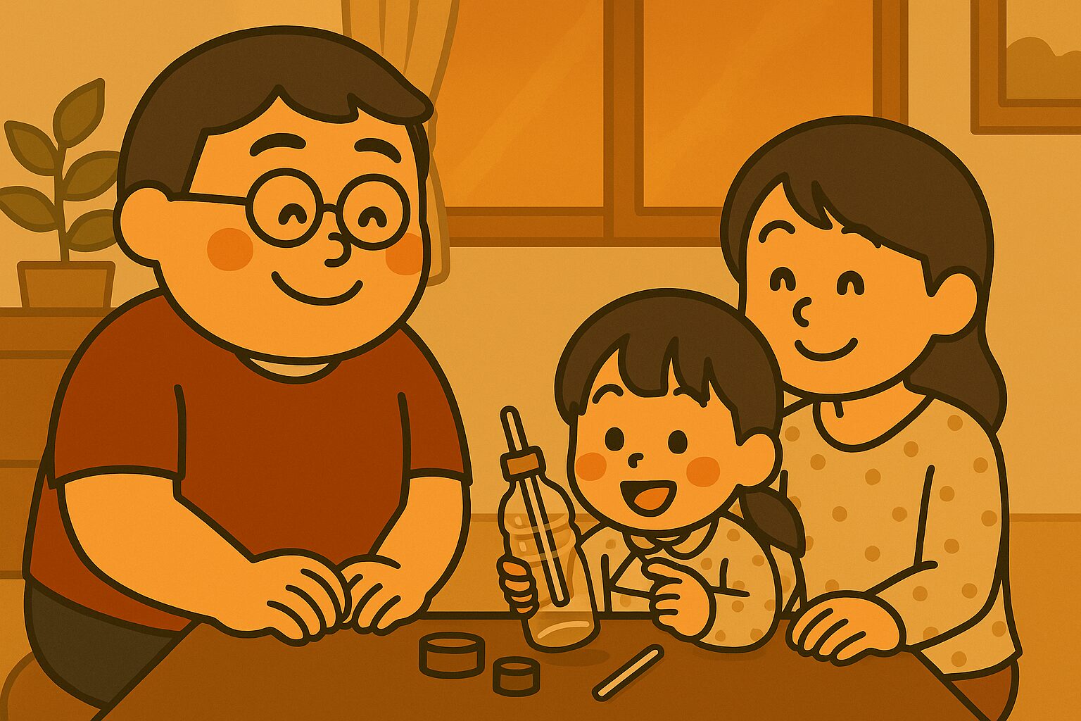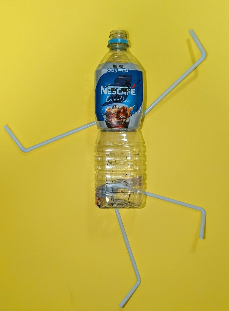 娘が「できたー!」と持ってきたのは、ペットボトルにストローを4本テープで貼りつけたもの。どうやらロボットに見立てた人形らしいです。うちの娘らしく作りはちょっと雑。でも、この人形にはしっかり名前がついていました。その名も――「332(さんさんに)」。